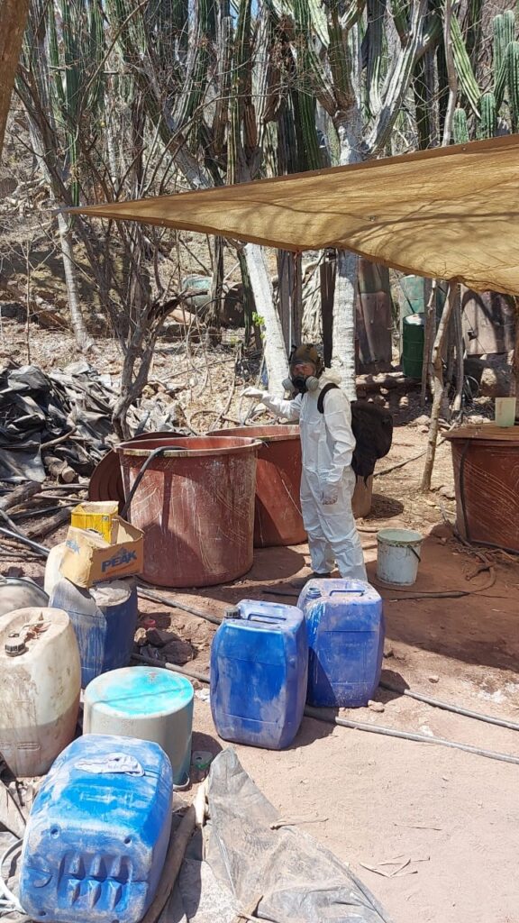 Los primeros tres laboratorios, usados para producir drogas sintéticas fueron detectados y asegurados en los municipios de Badiraguato, Cosalá y Elota. A estos aseguramientos y destrucción hechos hace una semana, se sumaron otros seis de los cuales la Secretaría de la Defensa Nacional (SEDENA) informó que “derivado de la planeación y los trabajos de inteligencia para detectar organizaciones criminales con presencia en esa entidad, dedicadas a la fabricación de drogas sintéticas, el Ejército Mexicano desplegó fuerzas de reacción a inmediaciones de los poblados de La Hilama, Vado Hondo, Bacata, Mezcaltitlán y Río Elota de referidos municipios, con la finalidad de localizar laboratorios clandestinos.