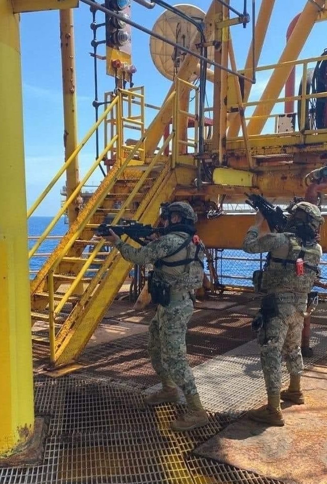 La plataforma Nohoch-Alfa está a unos 80 kilómetros de Campeche. Los marinos del 13 Batallón tenían alrededor de dios semanas de haber llegado a la plataforma para resguardarla de actos de piratería y sabotaje comunes en la zona.