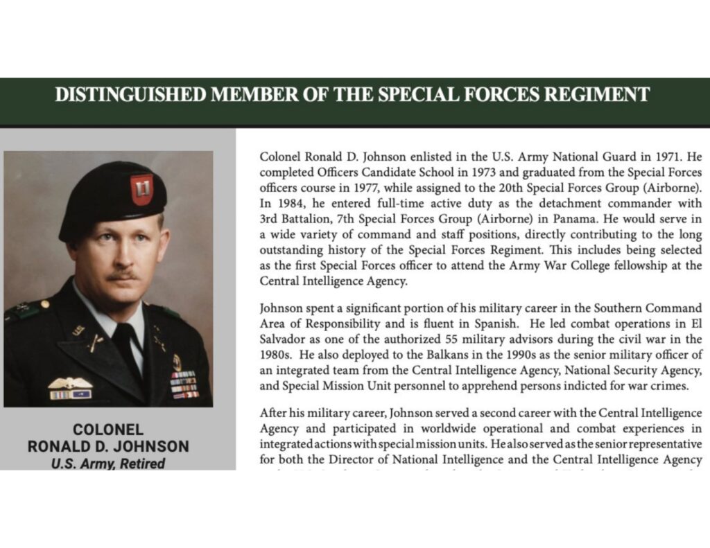 El coronel Ronald D. Johnson se alistó en la Guardia Nacional del Ejército de Estados Unidos en 1971, poco después ingresó a la Escuela de Aspirantes a Oficiales y se graduó en el curso de oficiales de las Fuerzas Especiales en 1977. En aquel año mientras estaba destinado en el 20º Grupo de Fuerzas Especiales (Aerotransportado), participó en varias misiones que le valieron algunos ascensos hasta que en 1984 fue designado como comandante de destacamento en el 3º Batallón, del famoso Séptimo Grupo de Fuerzas Especiales (Aerotransportado) en Panamá, una unidad reconocida por sus labores de infiltración, acopio de información de inteligencia y operaciones de contrainteligencia en organizaciones de tráfico de drogas y en grupos guerrilleros.