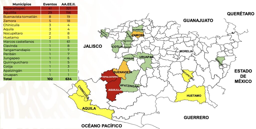 Tepalcatepec junto con Aguililla en la Tierra Caliente de Michoacán, son los dos municipios que de acuerdo con documentos militares, mantienen el mayor número de zonas minadas en todo el país. Un mapa del verano del 2022 ilustra cómo estos dos municipios –en rojo—son el epicentro de la guerra asimétrica caracterizada por el uso de drones equipados con AEI, minas terrestres, bandas paramilitares conformadas por extranjeros, como ex kaibiles guatemaltecos y militares colombianos, todos con preparación en tácticas de guerra irregular.
