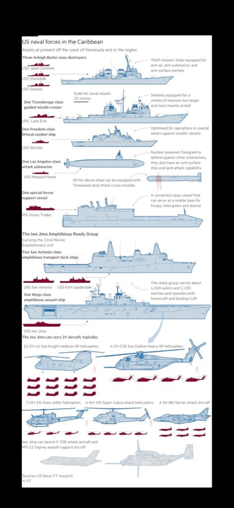 El periódico británico Financial Times publicó hace unos días una infografía de las fuerzas navales desplegadas en el Caribe en las últimas semanas. El gráfico no incluye al portaaviones USS Gerald R. Ford y su flota de combate que lo escolta, ya que el anuncio de su despliegue se hizo posterior a la publicación.