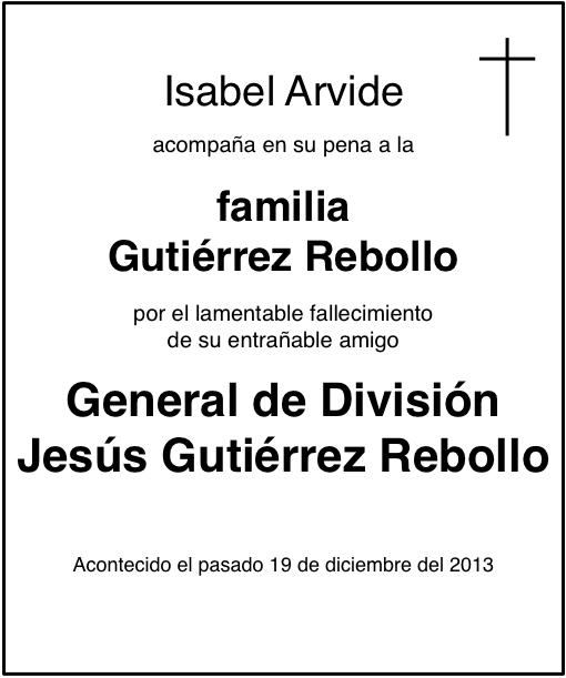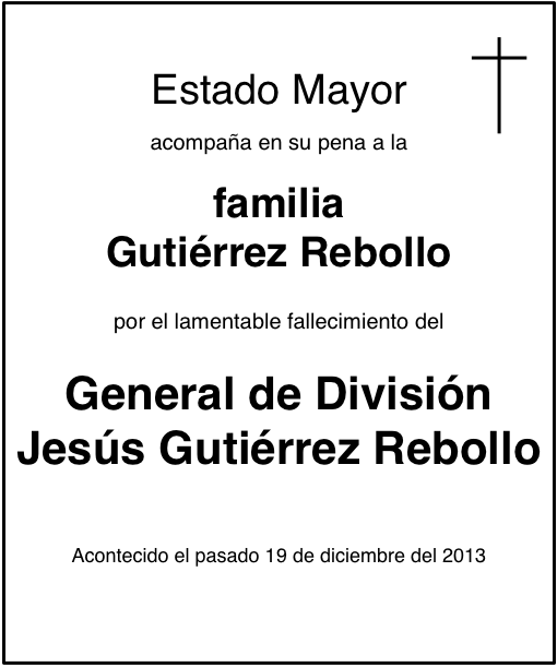 Fallecimiento General de División Jesús Gutiérrez Rebollo by Administrador • 20 de diciembre del 2013 El equipo de Estado Mayor e Isabel Arvide se unen a la pena de la familia Gutiérrez Rebollo. Me gusta esto:Me gusta Cargando... Relacionado