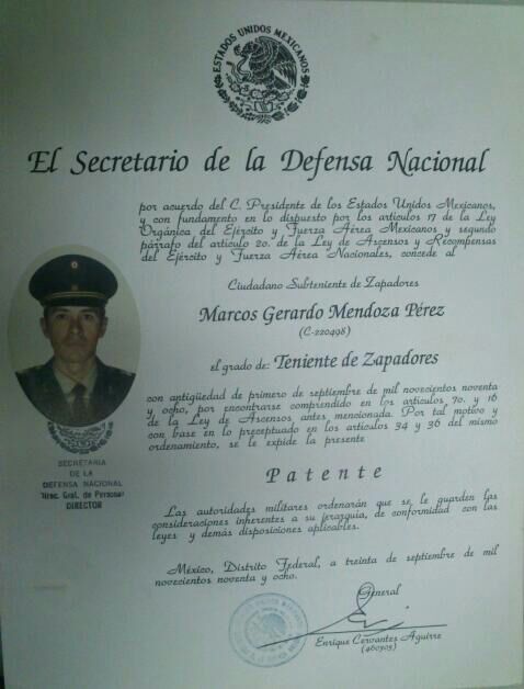 Marcos Gerardo Mendoza Pérez se presentó la mañana del pasado viernes 11 de julio del 2014 en la sala de Consejo de Guerra en el campo militar número uno. A las 9:00 horas el teniente escuchó en voz del fiscal militar un resumen de la acusación de abandono de servicio por el cual se le detuvo en el año 2010. Libre bajo fianza el oficial de zapadores se convirtió en “persona non grata” al exigir el respeto a sus derechos y que su caso se analizara desde la lógica y el razonamiento de que nunca faltó a sus responsabilidades. Aseguró que la acusación no tuvo sustento, pues se basó en un momento en que salió para recargar su teléfono celular y así mantenerse comunicado con sus superiores para la misión a la cual había sido encomendado.