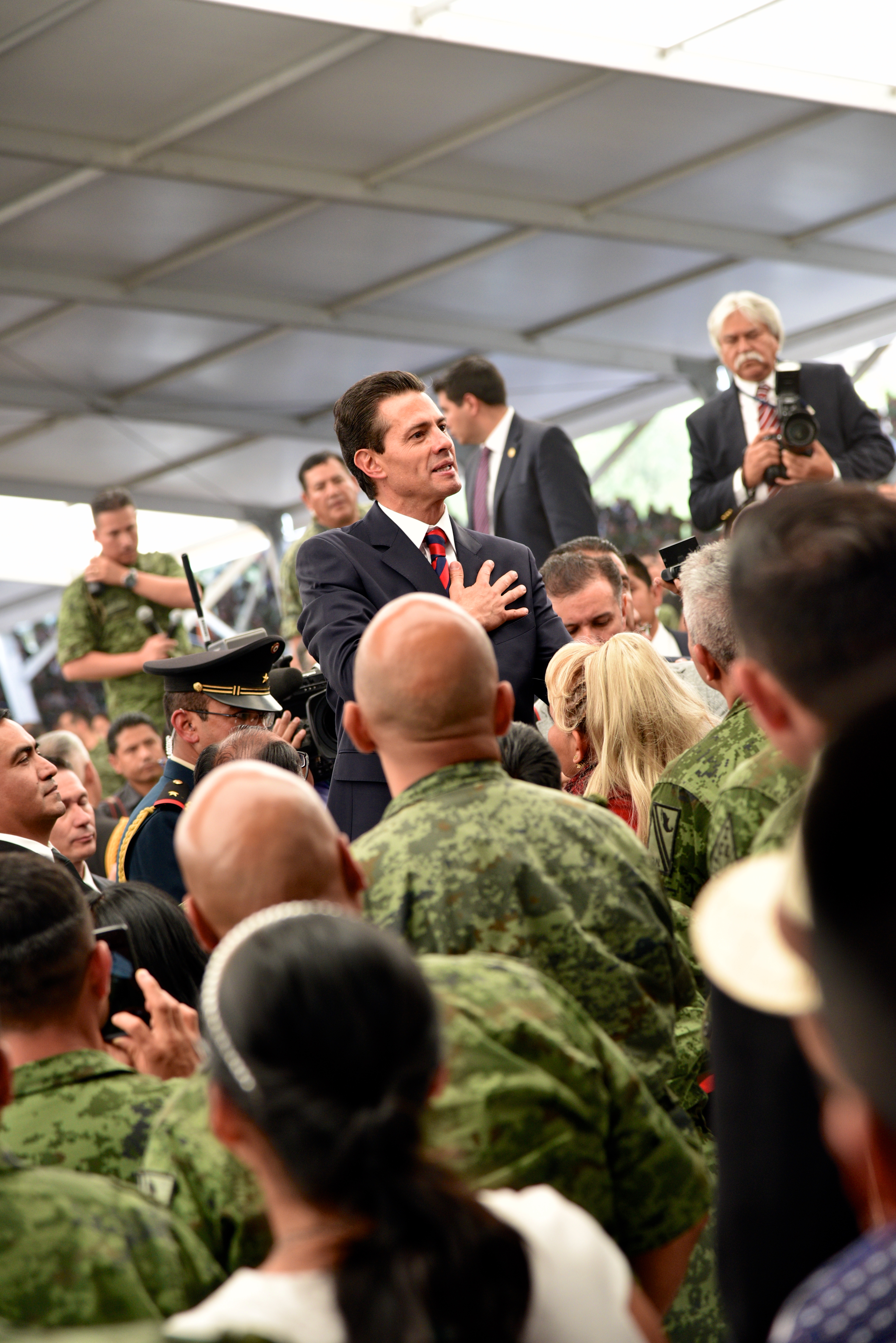 “Aquí están las familias de soldados, pilotos y marinos, que deben sentirse orgullosas del trabajo que realizan sus familiares, porque lo que hacen con el uniforme de la Patria, con el uniforme que portan todos los días, es cuidar a México y velar por México”, señaló.