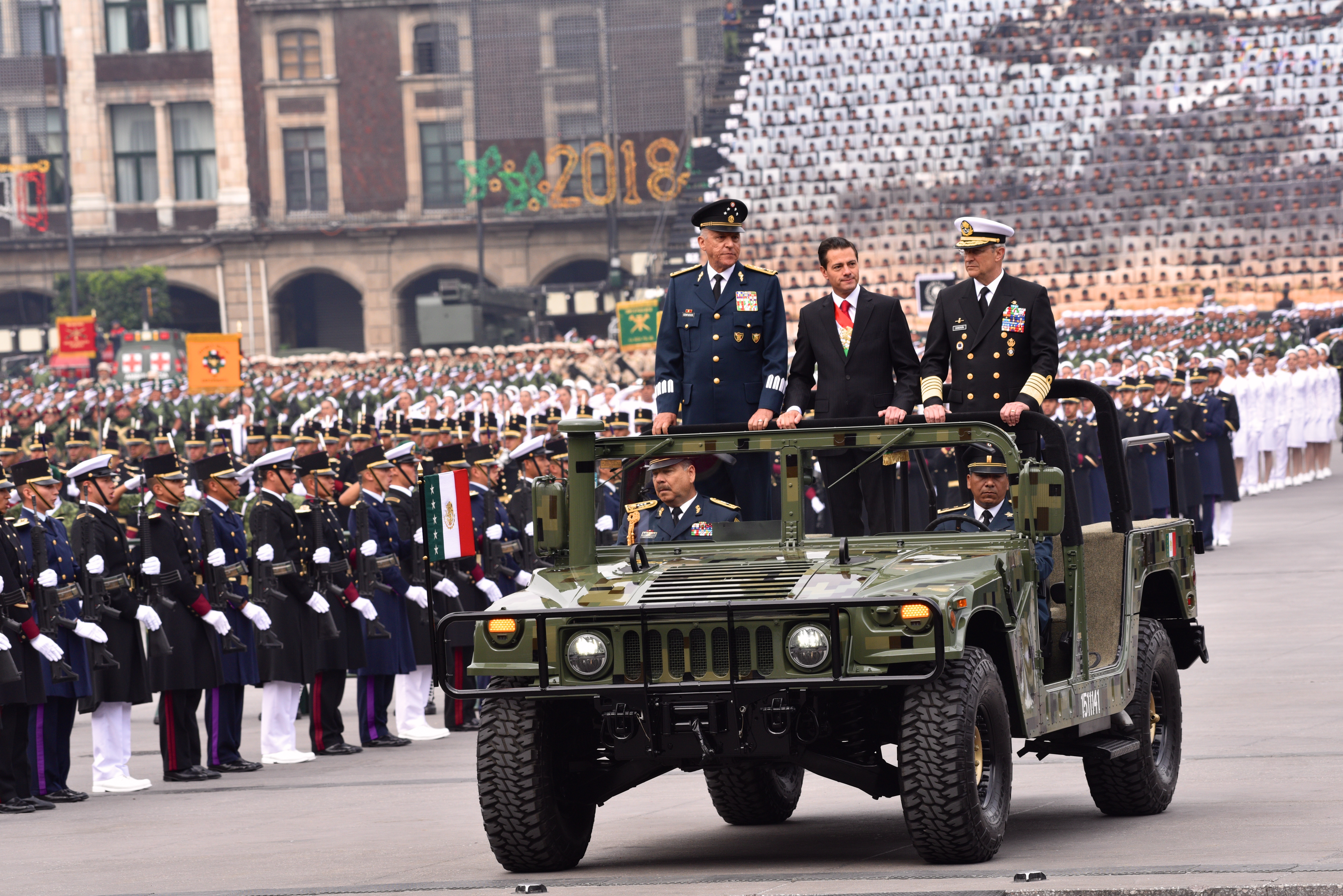 El Presidente Peña Nieto presenció el Desfile Militar acompañado por su esposa, Angélica Rivera de Peña; los representantes de los Poderes Legislativo y Judicial; los titulares de las Secretarías de Gobernación, de la Defensa Nacional y de Marina, así como por el Comisionado Nacional de Seguridad, Renato Sales Heredia.