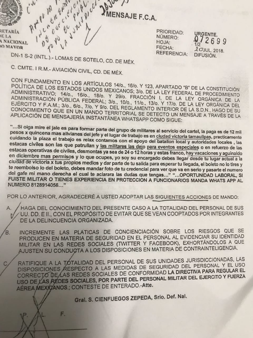 Este asunto en particular mereció la atención del secretario de la Defensa. En julio de este año el general Cienfuegos emitió un radiograma (número 072699) con carácter de URGENTE, fechado el 20 de ese mes.