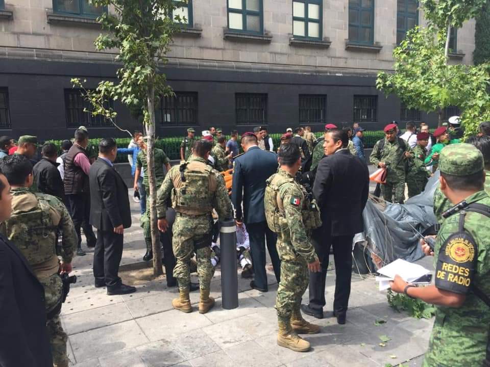 La Marina explica que “en esta operación, realizada como parte de la exhibición aérea del desfile 2019, el 2do. Maestre, Infante de Marina Fuerzas Especiales, Valente Mateo Hernández, realizó un ejercicio de infiltración a gran altura, en el cual al momento de llevar a cabo su aterrizaje frente a Palacio Nacional, basado en su adiestramiento especializado y derivado de los cálculos de espacio y maniobra, tomó la decisión de usar una zona de aterrizaje alterna, esto con el fin de evitar poner en riesgo la vida de otros paracaidistas o inclusive de los espectadores, acción que le provocó lesiones físicas”.
