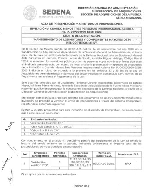 En tanto, Csirus S.A.P.I. de C.V. cotizó los servicios para el mantenimiento de los Mi-17 en 18 millones 533 mil 377 pesos con 63 centavos, cubriendo también tres partidas y 113 subpartidas.