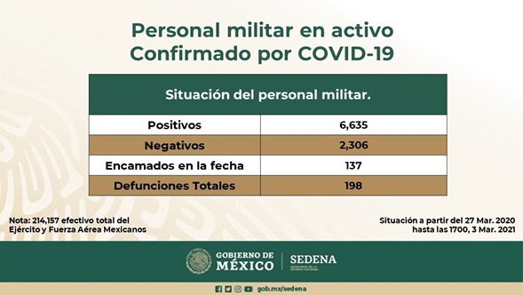 Para el caso del impacto que ha tenido el COVID en las filas de la SEDENA, los 6 mil 635 elementos contagiados hasta el 3 de marzo de 2021 equivalen a dos Brigadas, un Batallón y una Sección de arma o servicio padeciendo el coronavirus.