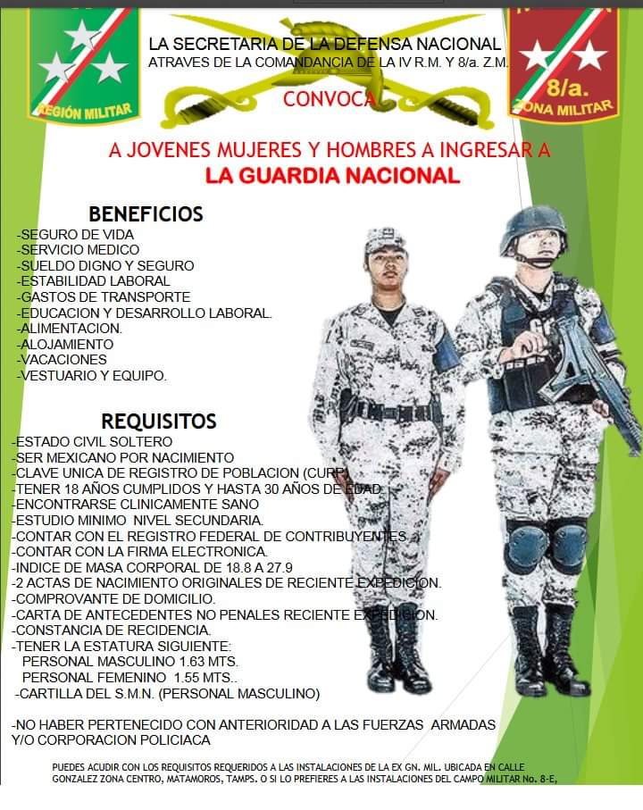La Comandancia de la Guardia Nacional convoca a hombres y mujeres que deseen formar parte de esta institución de seguridad pública y servir a la nación con legalidad, objetividad, eficiencia, profesionalismo, honradez, respeto irrestricto a los derechos humanos, mediante un proceso de reclutamiento
