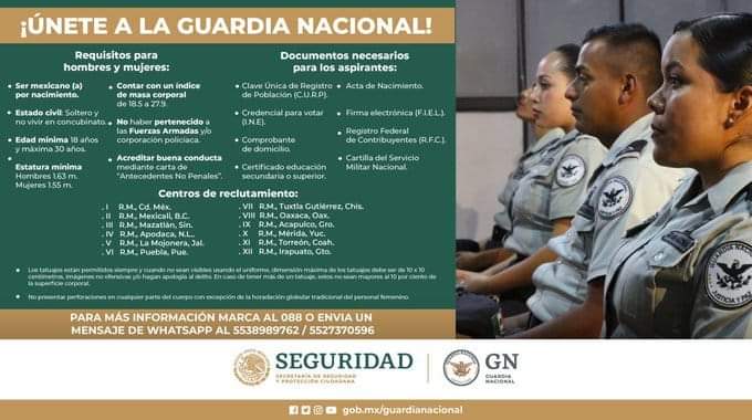 Para cualquier duda y/o aclaración se ponen a su disposición el número telefónico 57018411, extensión 1050, o acudir a los 12 Centros Regionales de reclutamiento; asimismo, en la página de internet https://www.gob.mx/guardianacional, se encuentran publicados los requisitos.