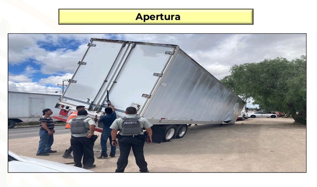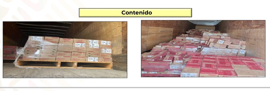 “Aquí podemos ver en las imágenes la situación en la que se encontró. Esa fue una denuncia ciudadana sobre la ubicación del tráiler, dónde estaba el tráiler y cómo estaba en riesgo. Personal de Guardia Nacional asistió al punto a verificar qué es lo que sucedía. Encontraron el tráiler, abrieron esta caja del tráiler y encontraron en el interior los cartuchos. A partir de ahí se estableció un dispositivo para dar la seguridad a ésta”, explicó el secretario de la Defensa Nacional.