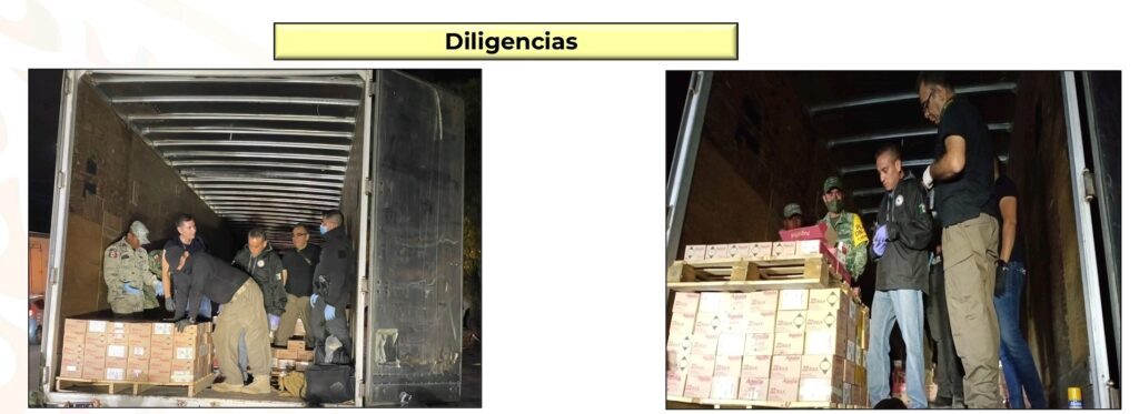 Sandoval explicó cómo se dio la localización de los cartuchos, señalando las imágenes en pantalla: “Aquí tenemos un gráfico donde podemos observar el lugar del robo el día 8, la localización de una instalación donde los indicios nos marcaron que ahí llevaron las cajas, ahí hicieron un movimiento de los cartuchos, ahí nos encontramos una placa del tráiler que había sido robado, estaba quemada, y aquí este punto es en donde se localizaron los cartuchos”