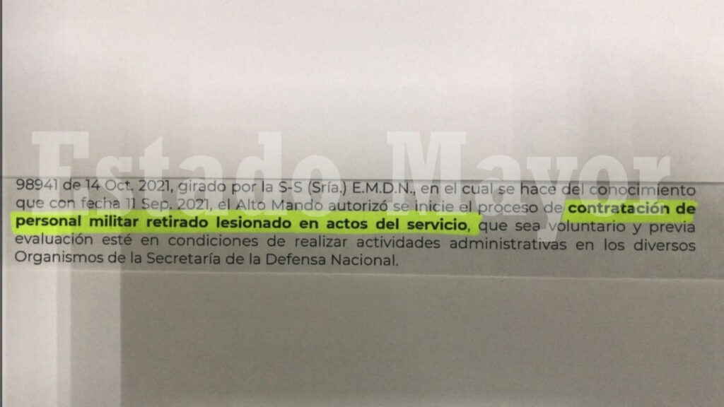 La orden fue dada mediante un radiograma (98941) fechado el pasado 11 de septiembre en la Ciudad de México, “girado por la S-S Sría) E.M.D.N.”, en el que se hace del conocimiento de los mandos territoriales la decisión del general Luis Cresencio Sandoval, secretario de la Defensa Nacional, de autorizar el inicio del “proceso de contratación de personal militar retirado lesionado en actos del servicio”, se indica en el mensaje.