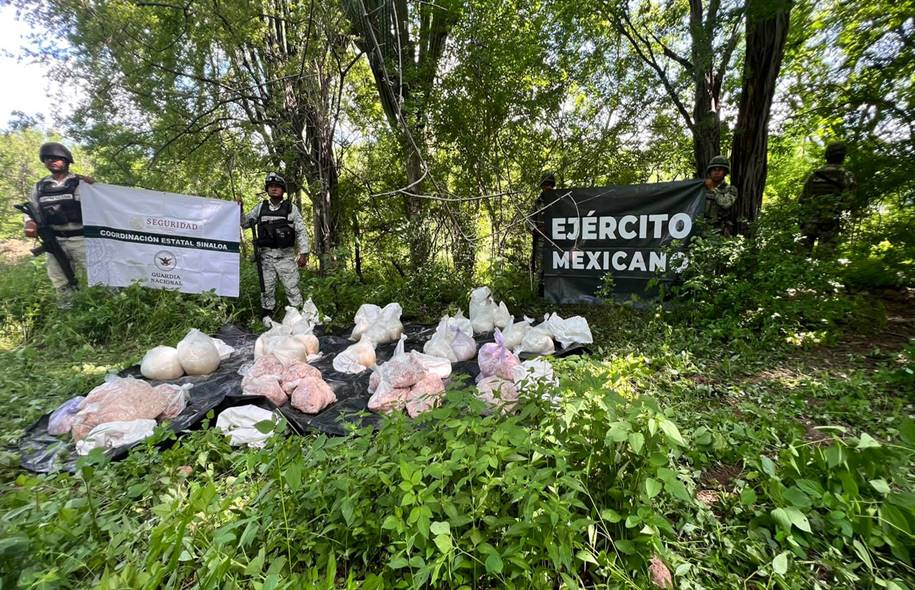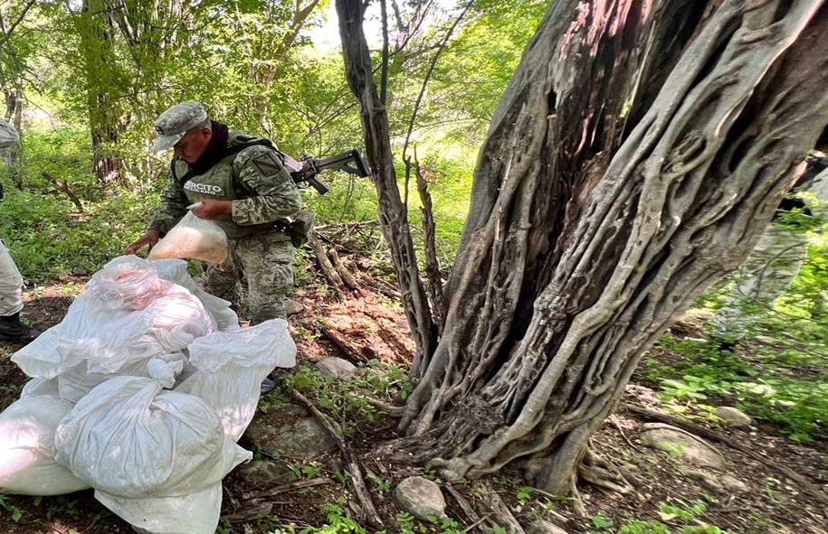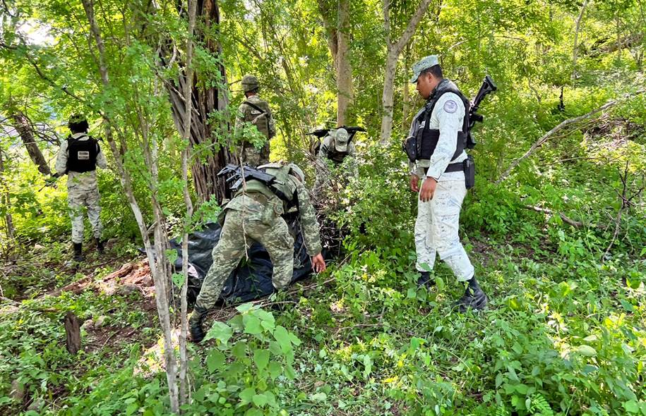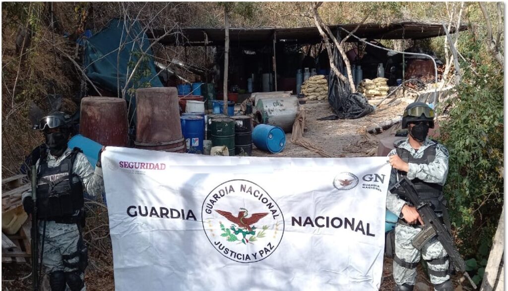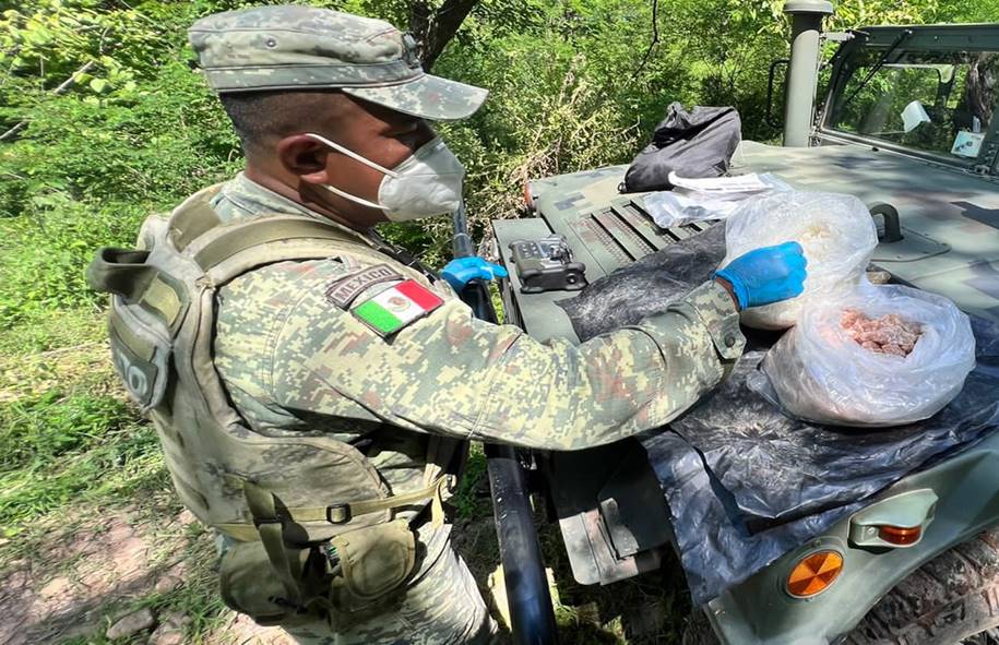 Ante tal situación, los agentes de la Guardia Nacional y personal del Ejército Mexicano delimitaron un área y procedieron a realizar reconocimientos terrestres, logrando identificar en el terreno una vereda que conducía a un lugar empleado para actividades ilícitas, por lo que las citadas autoridades establecieron un dispositivo de seguridad y procedieron a la revisión del lugar observando bolsas que en su interior contenían precursores químicos, empleados para procesar droga sintética, asegurándose: – 256.32 kilogramos de metanfetamina.