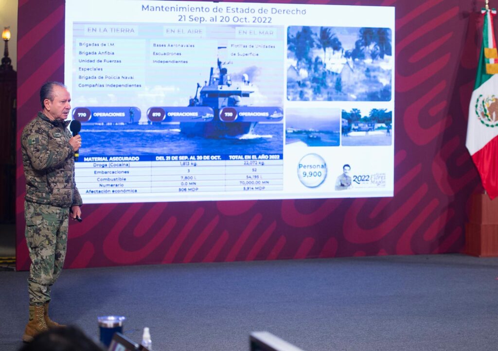 En lo referente a Mantenimiento del Estado de Derecho en la Mar, la Institución mantiene desplegado en la Tierra, en el Aire y en el Mar, Brigadas de Infantería de Marina, Escuadrones Aeronavales, y Flotillas de Superficie. En este último periodo, se llevaron a cabo 770 operaciones en tierra, 870 operaciones por aire y 730 en el mar; dando como resultado el decomiso de mil 813 kilogramos de cocaína, el aseguramiento de cuatro embarcaciones y ocho mil 700 litros de combustible.