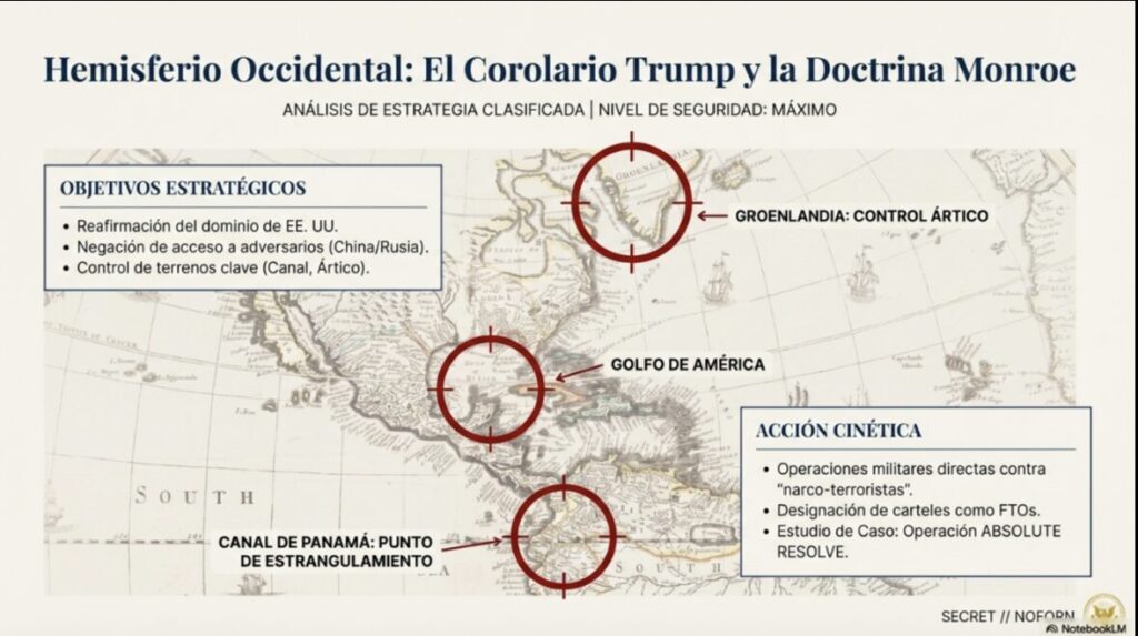 Otro de los objetivos del plan y que tiene que ver con México es que habla de “Asegurar el territorio clave en el hemisferio occidental”. De acuerdo como establece la Estrategia Nacional de Seguridad, “Estados Unidos ya no cederá el acceso ni la influencia sobre el territorio clave en el hemisferio occidental. Por lo tanto, la Declaración de Guerra brindará al presidente opciones creíbles para garantizar el acceso militar y comercial estadounidense a territorio clave desde el Ártico hasta Sudamérica, especialmente Groenlandia, Golfo de México y el Canal de Panamá. Garantizaremos el cumplimiento de la Doctrina Monroe en nuestros tiempos”.