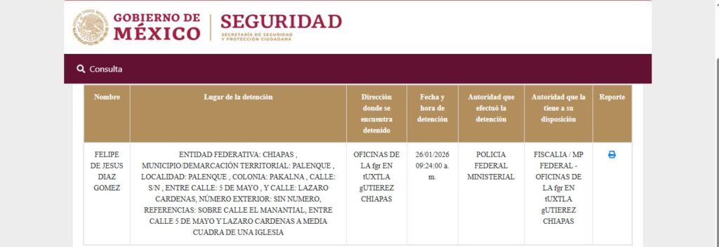 Su aseguramiento fue corroborado a través del Registro Nacional de Detenciones, donde, además, esta página perteneciente a la Secretaría de Seguridad y Protección Ciudadana (SSPC) arroja la ubicación exacta de la detención, siendo esta en las calles de 5 de Mayo y Lázaro Cárdenas, de la colonia Pakalna, a media cuadra de una iglesia.