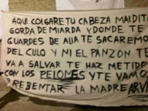 Este es el ámbito en que llega la manta firmada por “Los Pelones” que fue colgada de un puente en la carretera Playa del Carmen-Cancún la madrugada del día 27 de mayo del 2012, coincidiendo con una reunión de procuradores internacionales a la que debí asistir. Manta donde con lenguaje soez amenazan “colgarme” en ese puente después de “reventarme” y “darme por el culo”…