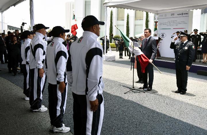 A su vez, el Comisionado General de la Policía Federal, Enrique Francisco Galindo Ceballos, les deseó éxito y les dijo que “llevan la gran responsabilidad de ser policías, pero también la gran responsabilidad de ser mexicanos que representan al país”. Deben mostrarse, señaló, con el orgullo que obliga llevar la bandera de México, el escudo de la policía y de la Secretaría de Gobernación, para demostrar que son capaces de cumplir con esta tarea, de salir adelante y sobre todo de salir exitosos.