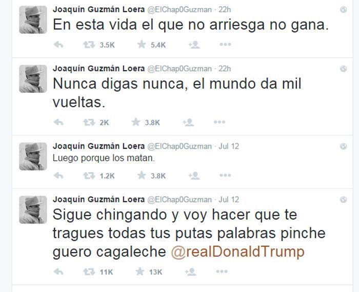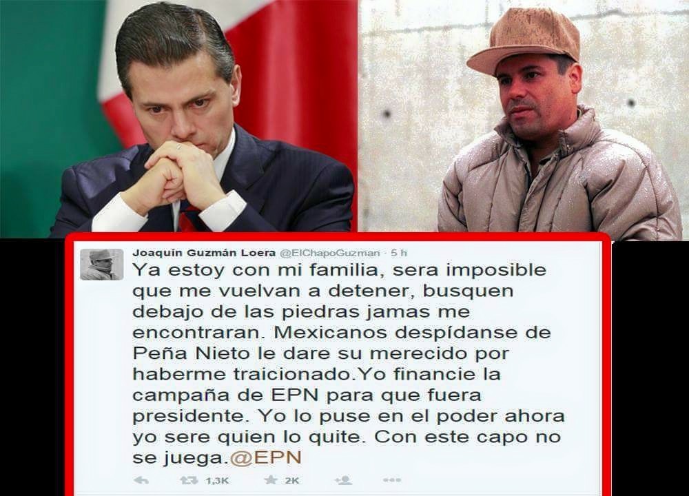 México, 14 de julio.- Poco después de darse a conocer la fuga de Joaquín Guzmán Loera del penal de Alta Seguridad del Altiplano, empezaron a circular en la redes sociales supuestos mensajes emanados de “cuenta oficial” de Twitter del líder del Cártel de Sinaloa (@ElChap0Guzman), en los cuales amenaza a diversas personalidades del entramado político nacional e internacional.