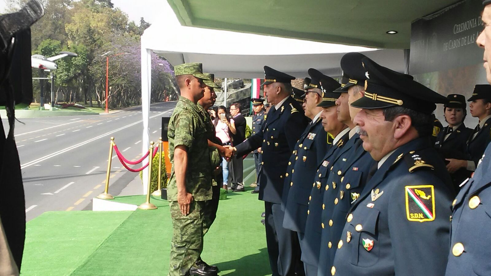 México, 10 de abril.- El General Salvador Cienfuegos Zepeda Secretario de la Defensa Nacional, presidió la Ceremonia de “Imposición de Ascensos al Grado Inmediato Superior, de Cabos de las Armas, Policía Militar y Fuerza Aérea Fusileros Paracaidistas”, la cual se realizó en la explanada Damián Carmona del Campo Militar No. 1-A, en la Ciudad de México.