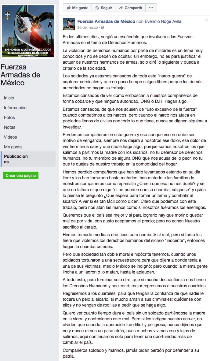 México, 19 de mayo.- Mediante una carta, la cual circula en redes sociales, prseuntamente soldados de tropa destacamentados en Tamaulipas manifestaron su deseo de regresar a los cuarteles en vista del hartazgo ocasionado por la lucha contra el crimen organizado.