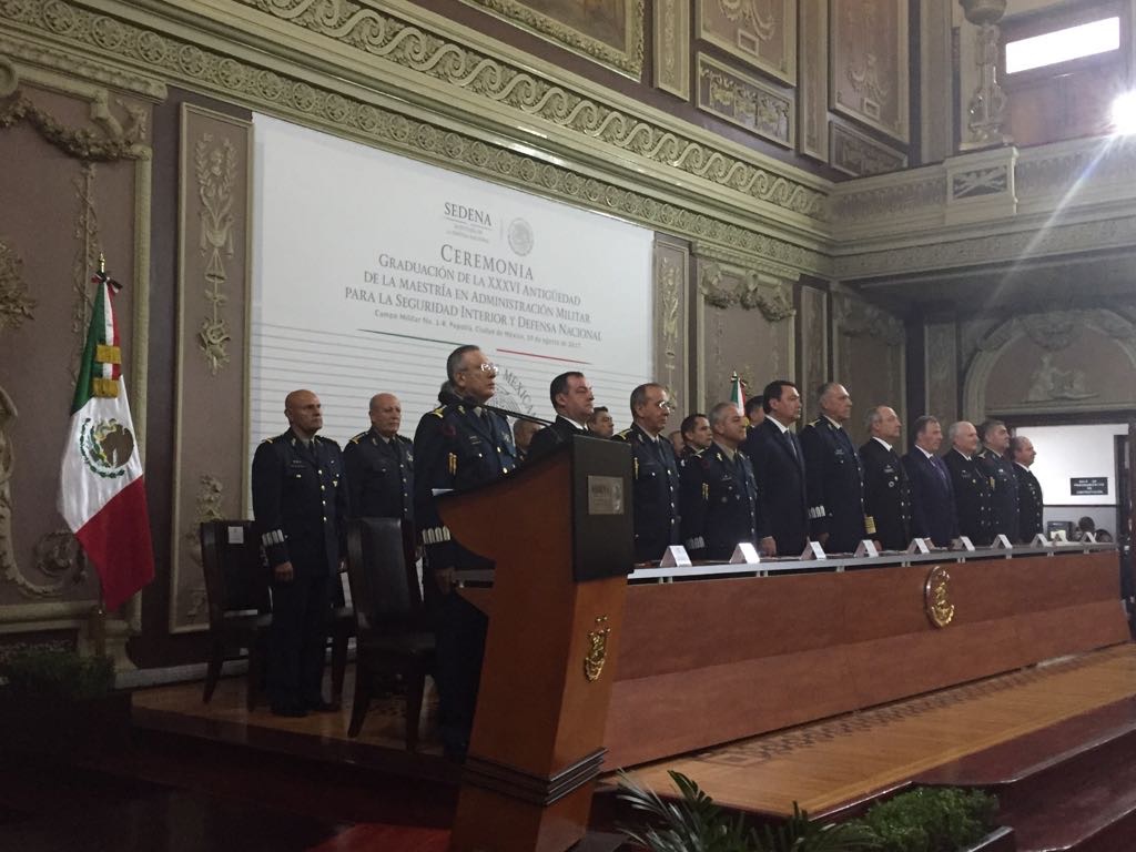 México, 11 de agosto.- En las instalaciones del Colegio de Defensa Nacional, el General Salvador Cienfuegos Zepeda, Secretario de la Defensa Nacional, acompañado del Miguel Ángel Osorio Chong, Secretario de Gobernación, Almirante Vidal Francisco Soberón Sanz, Secretario de Marina y Dr. José Antonio Meade Kuribreña, Secretario de Hacienda y Crédito Público, así como de funcionarios de esta Secretaría, presidió la ceremonia de graduación del personal que culminó sus estudios de Maestría en Administración Militar para la Seguridad Interior y Defensa Nacional.