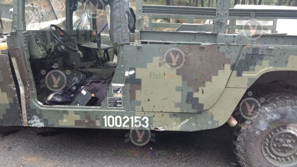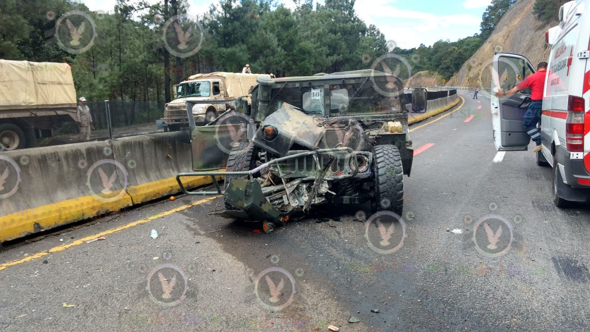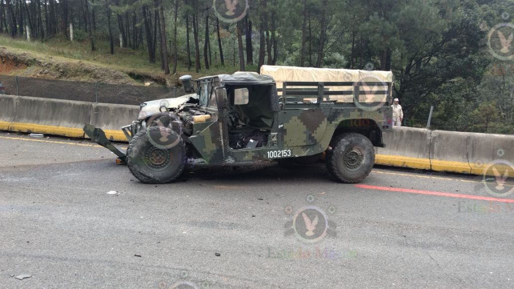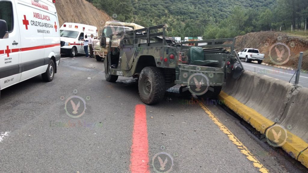 México, 6 de octubre.- Un vehículo Humvee del Ejército se estrelló este medio día en un tramo de la carretera Maravavatío-Zapotlanejo, cuando al salir de una brecha hacia la autopista su conductor perdió el control y se estrelló contraEditar detalles el talud y luego contra las dovelas que separan los carriles.