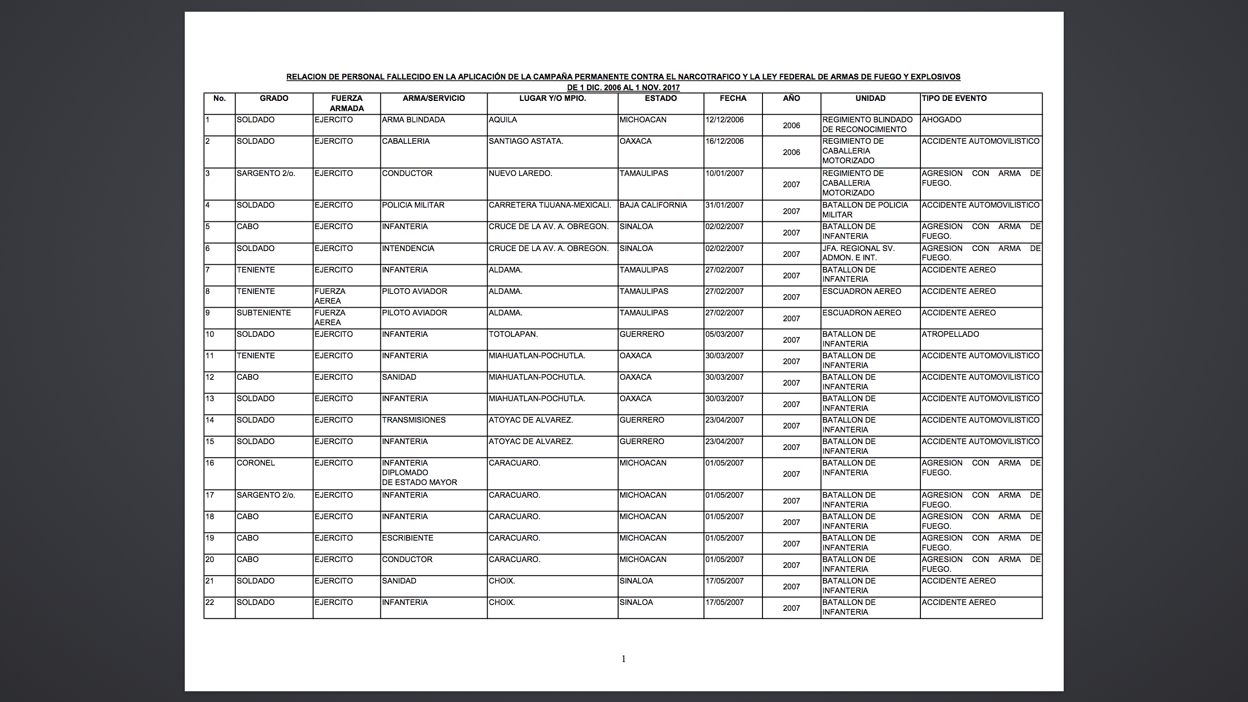 Hasta el 1° de octubre la lista de fallecidos en acciones directas contra el narco o en el contexto de la campaña antidrogas, era de 526 elementos. Se esperaba que en la siguiente actualización la Sedena incluyera a los siete elementos de las Fuerzas Especiales que murieron el 6 de octubre en un municipio de Durango, cuando el helicóptero Bell-407 en el que volaban se incendió y cayó a tierra, muriendo siete de sus ocho ocupantes.