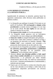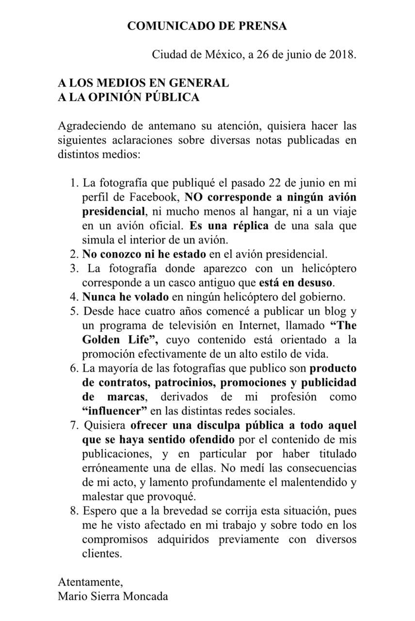 México, 27 de junio.- Con respecto a la información publicada el día de ayer, en la cual se daba a conocer el posible uso del Avión Presidencial para fines personales, por parte del hijo del General Roberto Sierra, Mario Sierra Moncada, fue publicado un comunicado de prensa, donde se explican los hechos impresos en las fotos y redes sociales de los implicados.
