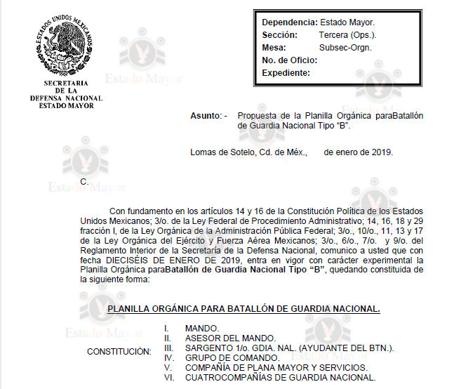 El documento, de 22 páginas, detalla cómo sería la orgánica de un Batallón de Guardia Nacional en el que cuatro coroneles y tenientes coroneles estarían al mando de dicha unidad, a la cual se contempla incorporar secciones de Información que encabezará un Capitán Primero de Arma, especialista en Inteligencia.