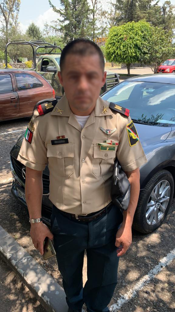 El detenido viajaba en un automóvil Aveo, con placas NFD-2947, del Estado de México, vistiendo uniforme militar con las insignias y grado de Capitán Segundo de Infantería que nunca alcanzó cuando estuvo en el ejército.