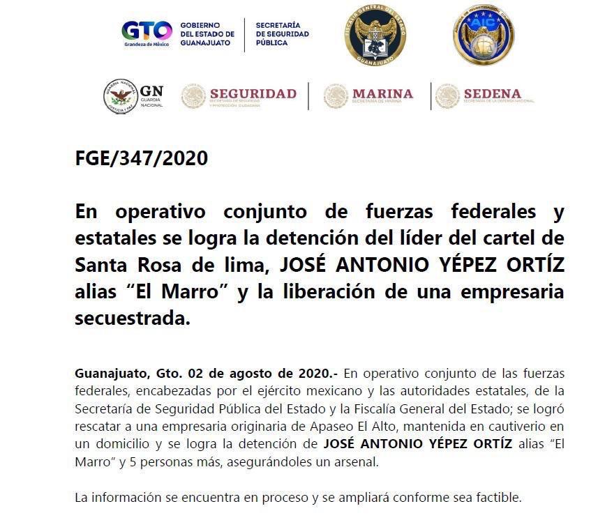 La SEDENA emitió un comunicado señalando que en una operación coordinada con la Fiscalía General del Estado de Guanajuato, se llevó a cabo la detención de José Antonio “N”, alias “El Marro”, presunto líder y fundador del “Cartel de Santa Rosa de Lima” (C.S.R.L.).