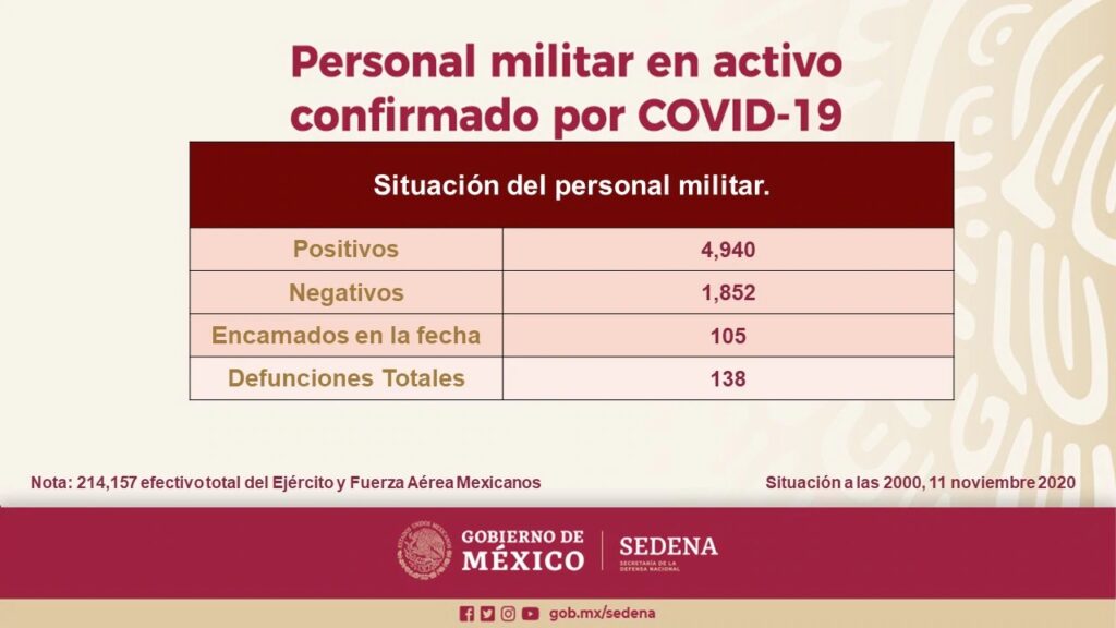 El reporte de la Defensa Nacional del miércoles 11 de noviembre, con corte de las 20:00 horas, señala 4 mil 940 contagios con 138 fallecimientos desde el 12 de marzo, fecha en la que la dependencia inició con los partes informativos sobre la “Situación del personal militar en el activo confirmado por COVID-19”.