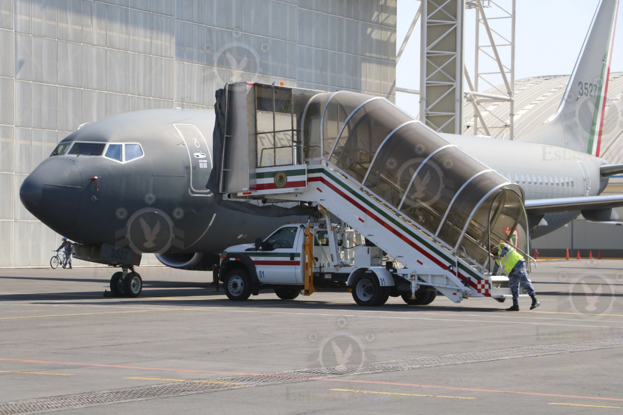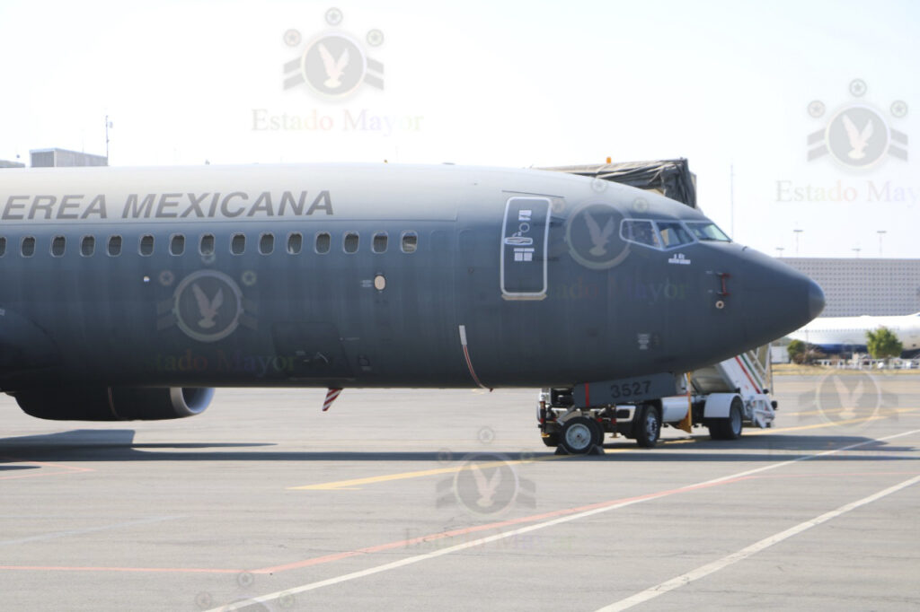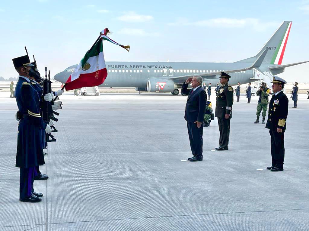 El presidente y su comitiva aterrizaron en Santa Lucía a las 09:12 de la mañana. El Boeing 737-800, Matrícula 3527, perteneciente al Escuadrón Aéreo 502 (Orcas), taxeó hasta ubicarse en la plataforma de la FAM, frente a los 11 hangares que forman parte de la infraestructura del AIFA. Antes de llegar a su posición final, la aeronave pasó por debajo del tradicional arco formado con chorros de agua a presión para ser bautizada junto con las instalaciones de la terminal militar.